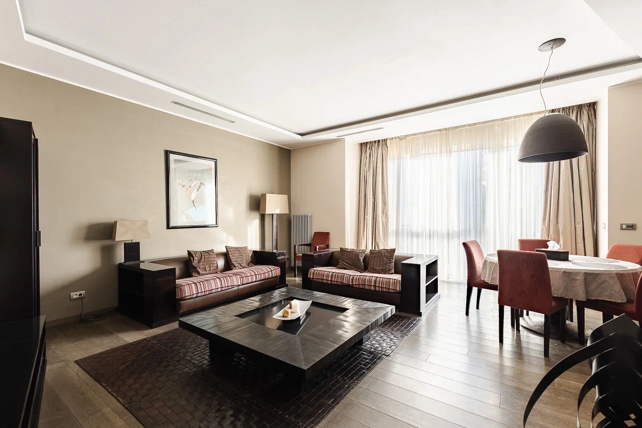 Интерьер этой квартиры в некотором смысле повторяет характерный облик самого дома – сочетание натурального камня и стекла создают ощущение прозрачности и легкости. Над дизайн-проектом пространства квартиры и комплектацией интерьера мебелью работали представители итальянского дизайн-бюро, творческим результатом которых стало появление этого стильного, эргономичного и запоминающегося интерьера.