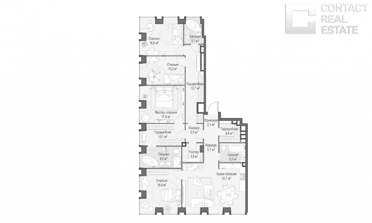Предлагается к продаже просторная светлая квартира, общей площадью 162 м2. Планировка предусматривает собой: кухню-гостиную с видом во внутренний двор парк, мастер спальня с гардеродной и санузлом, 2 отдельные спальни и возможность планирования кабинета. Окна квартиры ориентированы на 3 стороны света: северную, западную и южную. Из окон квартиры отрываются панорамные виды на Москва-сити и парк Красногвардейские пруды.