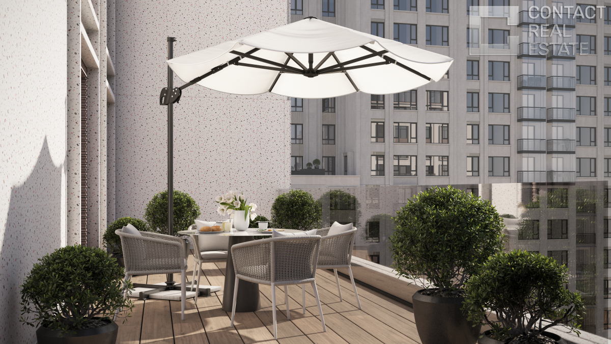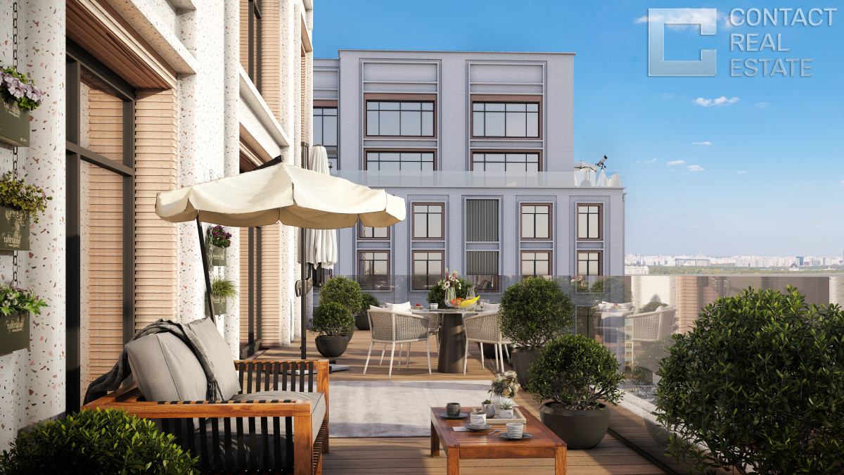 Для жителей четырех домов первой очереди на крыше торгово-развлекательного центра мы спроектировали большой, зелёный, приватный двор-сад. Обустроим коворкинг, детскую зону с песочницей и место для отдыха с лежаками. Летом у зоны с водным объектом можно заниматься фитнесом и йогой. А зимой наша управляющая компания поставит здесь ёлку и украсит перголы, создавая новогоднее настроение.