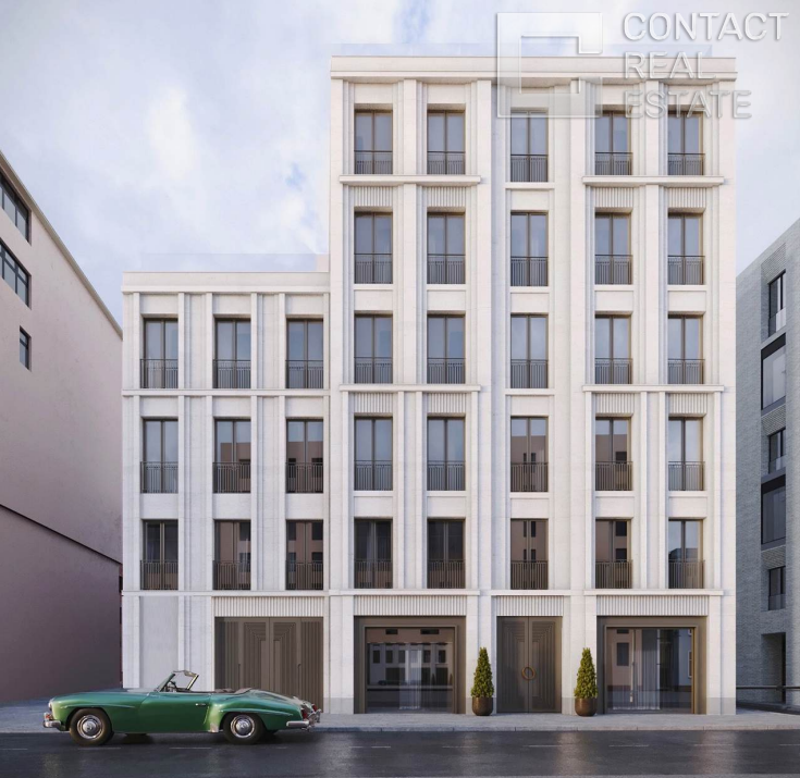 Нежная и взаимоприятная встреча неоклассики с современной эстетикой: окна в пол, французские балконы, целеустремленность вертикалей и сбалансированность пропорций