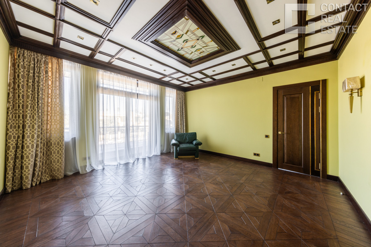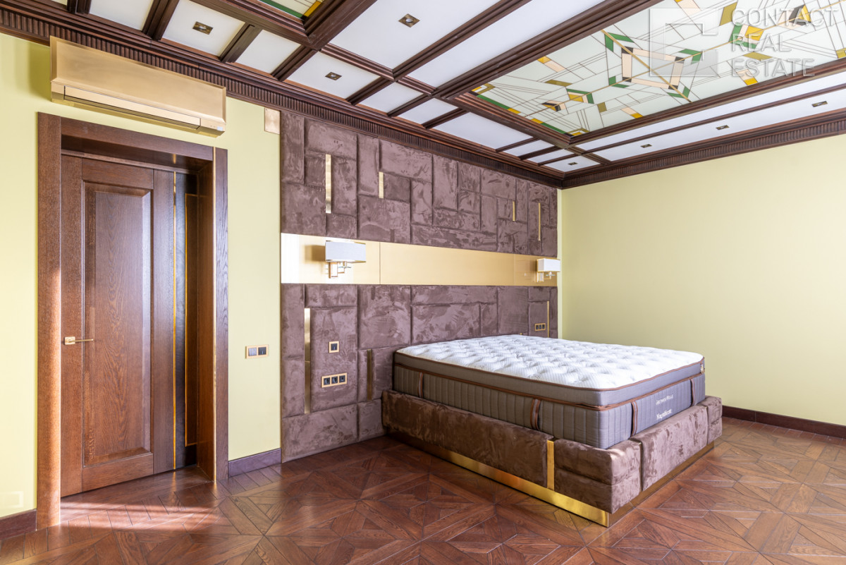 В стильном особняке общей площадью 1800 кв.м в стиле Райт расположены бильярдная, зона отдыха, кальянная, гостиная с камином, кухня, столовая, выход на террасу с джакузи и зоной барбекю, библиотека, гостевые спальни, спа-зона с бассейном, сауной, хаммамом. На цокольном этаже расположены 3 спортзала с профессиональными тренажерами Technogym, винная, танцпол, hi-end кинозал Dolby Atmos 14.4.6 с 8к проектором.