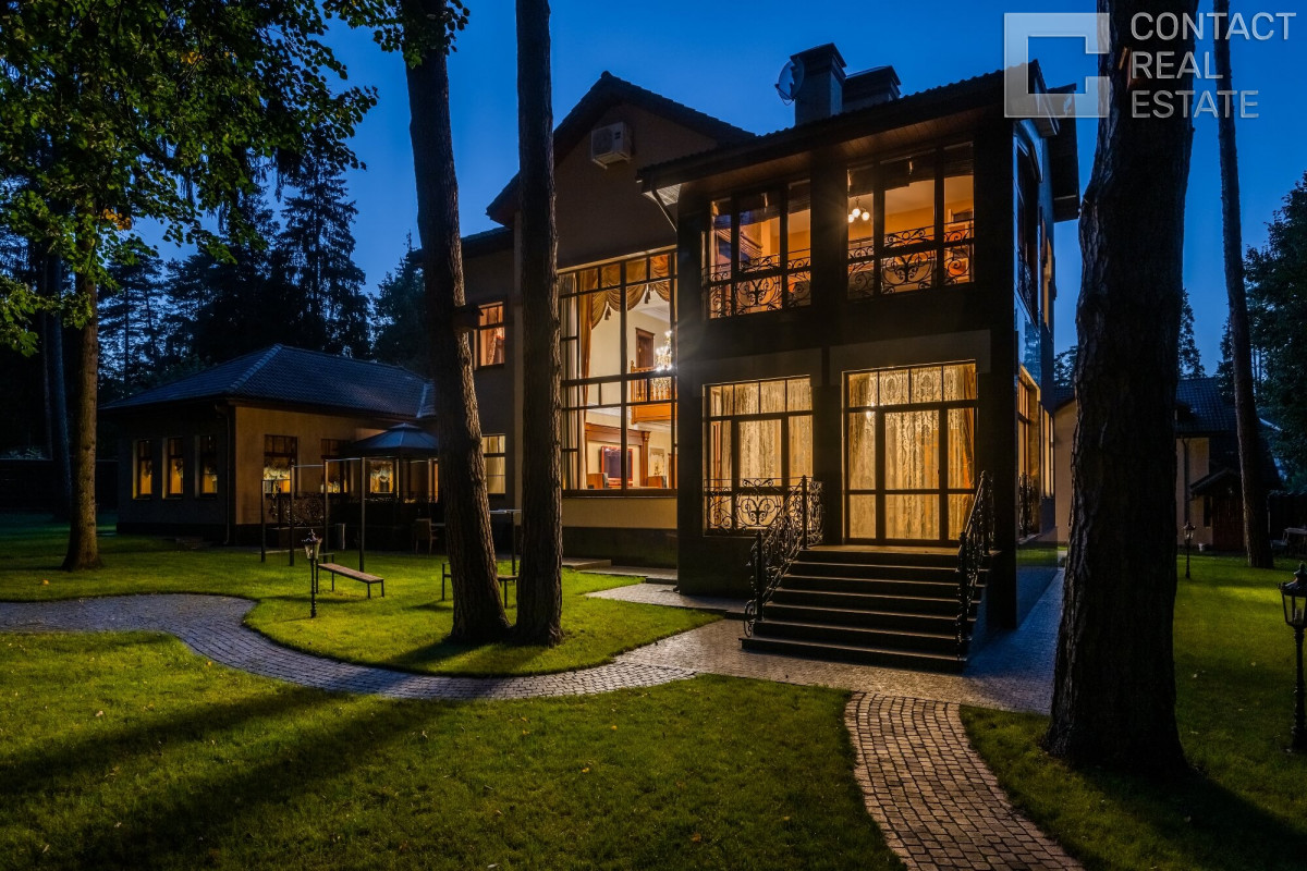 Ровный участок 30 соток с реликтовыми соснами. Проведены ландшафтные работы: высажен газон и декоративные деревья, сделано освещение. Дорожки и въездная группа выложены брусчаткой. На участке расположен гараж на 2 автомобиля, квартира для персонала с двумя спальнями, помещение для охраны, детский городок, зона барбекю.