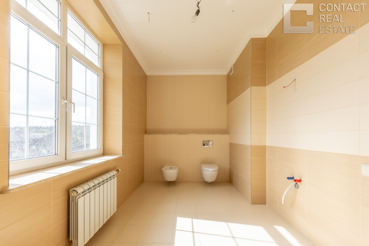 прослоек и Rockwool Кавити Баттс 100мм с армированной сеткой. Фасады отделаны гранитом и натуральным песчаником. Кровля – мягкая с утеплением минеральной ватой 250мм. Окна – ПВХ стеклопакеты. Полы первого этажа – керамогранит с водяным подогревом, на втором – мербау. Лестничный марш – монолитный, отделан дубом с подсветкой ступеней. Двери – массив дуба с резьбой. Коммуникации разведены под ключ. Сантехника – ''Villeroy & Bosch'' и ''Hansgrohe''. Газовый котел ''Buderus'' на 80кВт с бойлером на 350 л и защитой от перепадов напряжения. Сплит-система кондиционирования Mitsubishi Electric с индивидуальным контролем