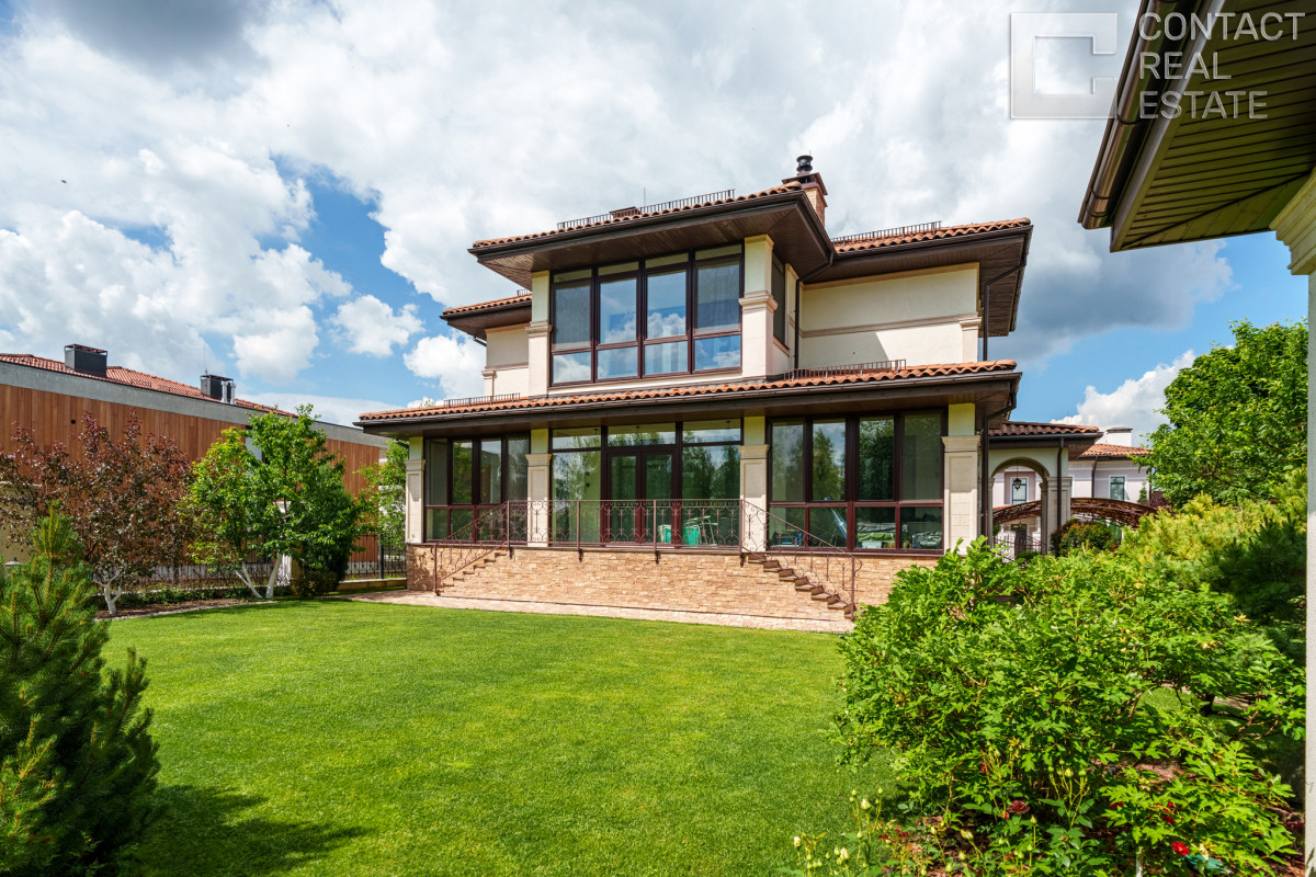 Участок правильной прямоугольной формы с ландшафтным дизайном, плодовыми деревьями. Помимо основного дома, расположен навес на 2 автомашины, и летняя закрытая терраса с печью и мангалом для барбекю. Цоколь: Котельная, комната отдыха, сауна, душевая, санузел, постирочная-гладильная, тренажерный зал, кладовая-мастерская.1 этаж: Холл, гардеробная, кухня, столовая-гостиная, закрытая терраса, гостевая спальня/ кабинет, кладовая, санузел. 2 этаж: Холл, 2 спальни, гардеробная, ванная комната, хозяйская спальня, ванная комната, гардеробная.